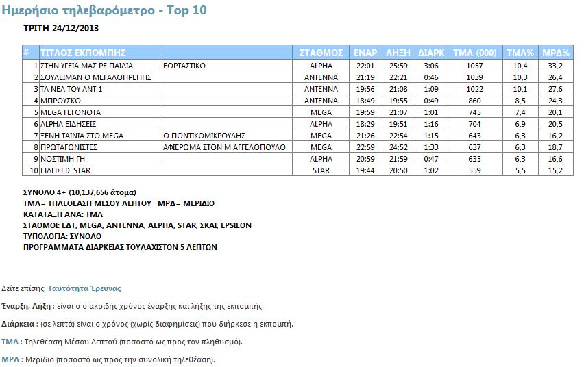 Δείτε το top 10 τηλεθέασης των τηλεοπτικών σταθμών εθνικής εμβέλειας για την παραμονή των Χριστουγέννων (24/12).