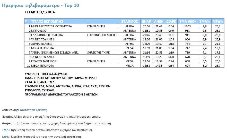 Δείτε το top 10 της τηλεθέασης των τηλεοπτικών σταθμών εθνικής εμβέλειας για την Πρωτοχρονιά (1/1).