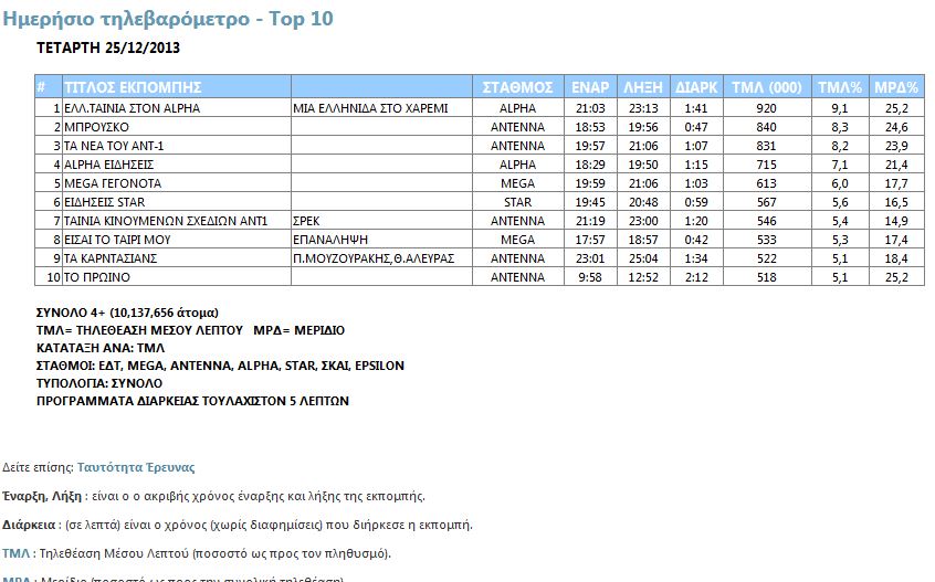 Δείτε το top 10 της τηλεθέασης των τηλεοπτικών σταθμών εθνικής εμβέλειας για την ημέρα των Χριστουγέννων (25/12).