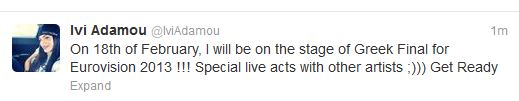 Η Ήβη Αδάμου μόλις πριν από λίγο έγραψε στον προσωπικό της λογαριασμό στο twitter ότι θα τραγουδήσει στον τελικό της Eurovision.