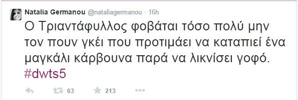 Την εμφάνιση του Τριαντάφυλλου στην πρεμιέρα του “Dancing with the stars” σχολίασε μέσω twitter η Ναταλία Γερμανού.