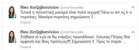 Η Βίκυ Χατζηβασιλείου σχολίασε μέσω twitter τις πρεμιέρες των δύο πρωινών εκπομπών.