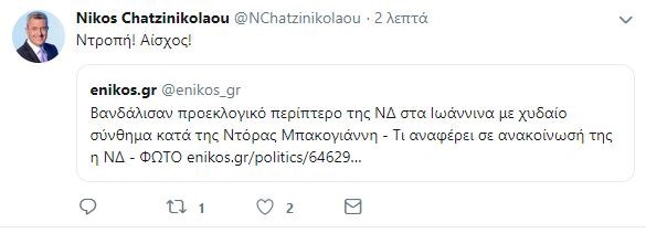Με tweet στον προσωπικό του λογαριασμό ο Νίκος Χατζηνικολάου σχολίασε τον βανδαλισμό του προεκλογικού περιπτέρου της ΝΔ στα Ιωάννινα με χυδαίο σύνθημα κατά της Ντόρας Μπακογιάννη.«Ντροπή! Αίσχος!», ανέφερε στην ανάρτησή του ο Νίκος Χατζηνικολάου που συνοδευόταν από την είδηση του βανδαλισμού του περιπτέρου του κόμματος της Αξιωματικής Αντιπολίτευσης με το χυδαίο σύνθημα κατά της κας. Μπακογιάννη.Δείτε την ανάρτηση:
