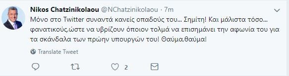 Ανάρτηση για τους υβριστές οπαδούς του πρώην πρωθυπουργού,Κώστα Σημίτη έκανε πριν από λίγο στον προσωπικό του λογαριασμό στο Twitter ο Νίκος Χατζηνικολάου.«Μόνο στο Twitter συναντά κανείς οπαδούς του… Σημίτη! Και μάλιστα τόσο… φανατικούς,ώστε να υβρίζουν όποιον τολμά να επισημάνει την αφωνία του για τα σκάνδαλα των πρώην υπουργών του! Θαύμα,θαύμα!», έγραψε ο Νίκος Χατζηνικολάου.Δείτε την ανάρτηση: