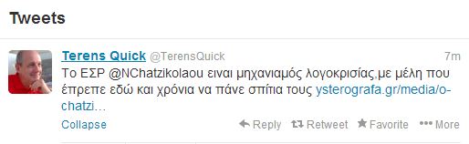 «Το ΕΣΡ @NChatzinikolaou είναι μηχανισμός λογοκρισίας, με μέλη που έπρεπε εδώ και χρόνια να πάνε σπίτια τους» και παραπέμπει στο σχόλιο του Νίκου Χατζηνικολάου που αναδημοσιεύεται στην ιστοσελίδα ysterografa.