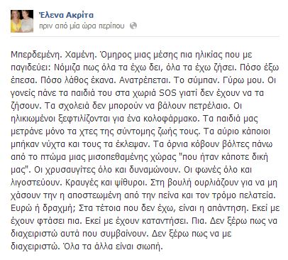 Η Έλενα Ακρίτα έκανε μια ανάρτηση στην προσωπική της σελίδα στο Facebook, αναφέροντας ότι ” Δεν ξέρω πώς να διαχειριστώ αυτά που συμβαίνουν. Δεν ξέρω πώς να με διαχειριστώ”…