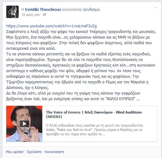 “Σαφέστατα ο Άλεξ αξίζει την ψήφο του κοινού! Υπέροχος τραγουδιστής και μουσικός. Μην ξεχνάτε, ένα παιχνίδι είναι…ας χαλαρώσουν κάποιοι και ας ΜΗΝ τα βάζουν με τους Κύπριους που ψηφίζουν. Στην τελική δεν ψηφίζουν άσχετους, αλλά παιδιά που αντικειμενικά είναι όλα καλά.