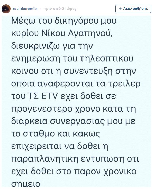 “Μέσω του δικηγόρου μου κυρίου Νίκου Αγαπηνού, διευκρινίζω για την ενημέρωση του τηλεοπτικού κοινού ότι η συνέντευξη στην οποία αναφέρονται τα τρέιλερ του ΤΣ ΕΤV έχει δοθεί σε προγενέστερο χρόνο κατά τη διάρκεια της συνεργασίας μου με το σταθμό και κακώς επιχειρείται να δόθει η παραπλανητική εντύπωση ότι έχει δοθεί στο παρόν χρονικό σημείο. Ρούλα Κορομηλά”, έγραψε η παρουσιάστρια.