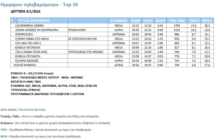 Δείτε το χθεσινό (6/1) top 10 της τηλεθέασης των τηλεοπτικών σταθμών εθνικής εμβέλειας.
