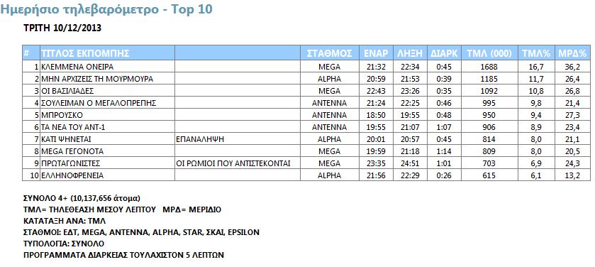 Δείτε το χθεσινό (10/12) top 10 τηλεθέασης των τηλεοπτικών σταθμών εθνικής εμβέλειας.