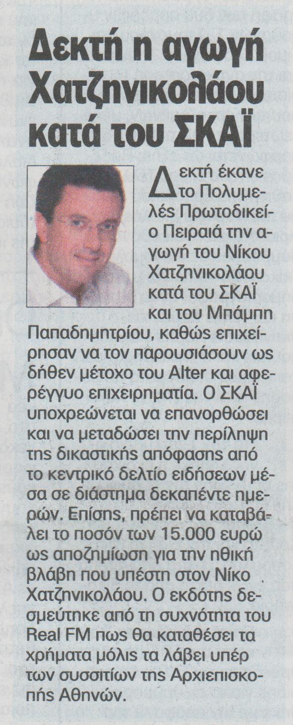 Τυπολογίες: Δεκτή η αγωγή Χατζηνικολάου κατά του ΣΚΑΪ