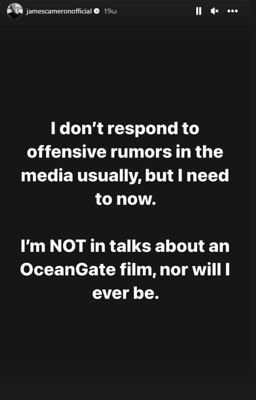 «Συνήθως δεν απαντώ σε προσβλητικές φήμες στα μέσα ενημέρωσης, αλλά χρειάζεται τώρα», έγραψε ο Κάμερον, 68 ετών, σε μια δήλωση που δημοσιεύτηκε στις ιστορίες του στο Instagram το Σάββατο, 15 Ιουλίου. «ΔΕΝ είμαι σε συζητήσεις για μία ταινία για το OceanGate, ούτε θα κάνω τέτοιες συζητήσεις ποτέ».