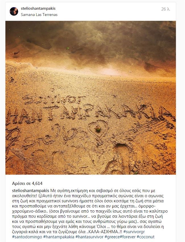Ο Στέλιος Χανταμπάκης, παρόλο που αποχώρησε από το Survivor, βρίσκεται ακόμα στον Άγιο Δομίνικο, απολαμβάνοντας στιγμές χαλάρωσης, ενώ φροντίζει να ανεβάζει συχνά φωτογραφίες στον προσωπικό του λογαριασμό στο Instagram, ενημερώνοντας τους διαδικτυακούς του φίλους για τις δραστηριότητές του στο νησί.Ο πρώην παίκτης των «Διασήμων», πριν από λίγο ανέβασε στο Instagram μία ακόμη φωτογραφία, από την παραλία, γράφοντας ένα συγκινητικό μήνυμα προς τους φίλους του.«Με αγάπη, εκτίμηση και σεβασμό σε όλους εσάς που με ακολουθείτε! Αυτό ήταν ένα παιχνίδι, ο πραγματικός αγώνας είναι ο αγώνας στη ζωή και πραγματικοί survivors είμαστε όλοι όσοι κοιτάμε τη ζωή στα μάτια και προσπαθούμε να ανταπεξέλθουμε σε ότι και αν μας έρχεται… όμορφο-χαρούμενο-άδικο.. (όσοι βγαίνουμε από το παιχνίδι ίσως αυτό είναι το καλύτερο πράγμα που κερδίσαμε από το survivor… να βγούμε σαν λιοντάρια έξω στη ζωή και να προσπαθήσουμε για εμάς και τους ανθρώπους γύρω μας).. σας αγαπώ, τους αγαπώ και μην ξεχνάτε λάθη κάνουμε Όλοι … το θέμα είναι να δουλεύει η ζυγαριά καλά και να τα ζυγίζουμε όλα ..ΚΑΛΑ-ΑΣΧΗΜΑ..!!», ήταν το μήνυμα που συνόδευε την ανάρτηση του παρουσιαστή.