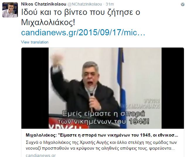 Ένα βίντεο του οποίου αρνήθηκε την ύπαρξή του ο Νίκος Μιχαλολιάκος, ανήρτησε χθες στο twitter ο Νίκος Χατζηνικολάου.