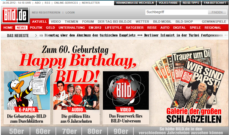 Η εφημερίδα με τη μεγαλύτερη αναγνωσιμότητα στην Ευρώπη, η “αγαπημένη μας” Bild, γιορτάζει σήμερα, 24 Ιουνίου, τα 60στα της γενέθλια.