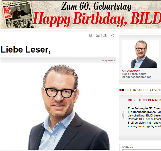 «Δωρεάν “Bild” για όλους» έγραφε η εφημερίδα στον πρωτοσέλιδο τίτλο της πάνω από μια ανοιχτή επι��τολή του διευθυντή της, Κai Diekmann. «Η “Bild” γιορτάζει σήμερα τα 60α της γενέθλια. Και αυτή η εφημερίδα είναι το δώρο σας», έγραψε ο Diekmann:
