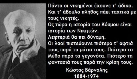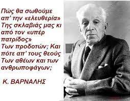 Ο Βάρναλης, είναι εκείνος που «Στην αληθινή απολογία του Σωκράτη» προειδοποιεί: «Αλίμονο στον αφτόδουλο πολίτη, που φτασμένος στα έσχατα της απελπισιάς, παραδίνεται για να σωθεί, στο έλεος του Θεού και στους νόμους των κλεφτών».