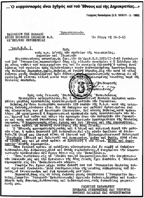Πανταχόθεν καταγγέλλεται, ότι η Κομμουνιστική Νεολαία Λαμπράκη καταβάλλει μεγάλας προσπαθείας προσεταιρισμού Μαθητών Γυμνασίων. Βεβαίως εφ ́ όσον διεπιστώθη ποσοστόν 12% οπαδών της ΕΔΑ κατά τας τελευταίας εκλογάς ευνόητον είναι ότι θα υπάρξουν και μαθηταί εμποτισμένοι από τας οικογενείας των με αριστεράν ιδεολογίας. Και αυτούς, βεβαίως, κατά πρώτον λόγον, θα χρησιμοποιή η κομμουνιστική προπαγάνδα προς προσηλυτισμόν των Νέων. Εφιστώ δια τούτο και πάλιν την προσοχήν όλων των Καθηγητών των Γυμνασίων και τους καθιστώ υπευθύνους δια πάσαν σχετικήν δραστηριότητα της Νεολαίας Λαμπράκη. Ο Κομμουνισμός είναι εχθρός και του Έθνους και της Δημοκρατίας. Και τούτο πρέπει να καταστεί συνείδησις της Νέας Γενεάς. Ο Εθνικός φρονηματισμός, καθώς και η ηθική και πολιτική αγωγή των μαθητών είναι η πρώτη αποστολή του Διδασκάλου. Και εις αυτή οφείλουν να επιδοθούν. Τα ιδικά μας ιδανικά είναι τα ιδανικά του