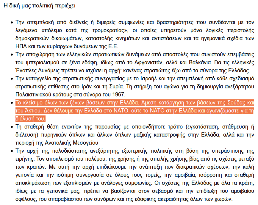 «…η απεμπλοκή από το ΝΑΤΟ, η κατάργηση των ξένων στρατιωτικών βάσεων, η αποτροπή της στρατιωτικής συνεργασίας με το Ισραήλ και η εφαρμογή της αρχής “κανείς Έλληνας στρατιώτης σε πολεμικά μέτωπα έξω από τα σύνορα της χώρας” συνιστούν άξονες της εξωτερικής μας πολιτικής».