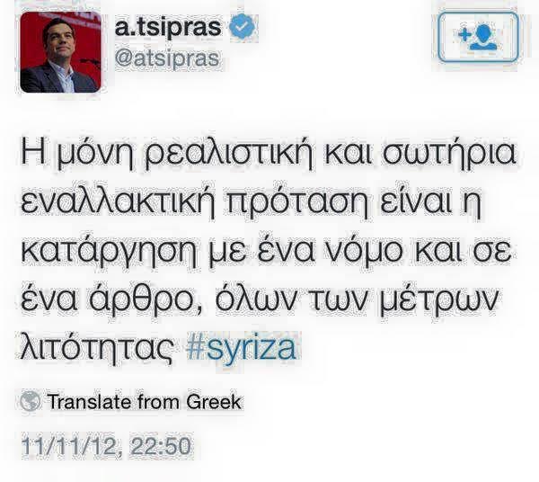 Όσο για το «Εκλογικό Πρόγραμμα» του ΣΥΡΙΖΑ (Μάης 2012), εκεί ήταν που το κόμμα του κ.Τσίπρα υποσχόταν – μεταξύ άλλων:
