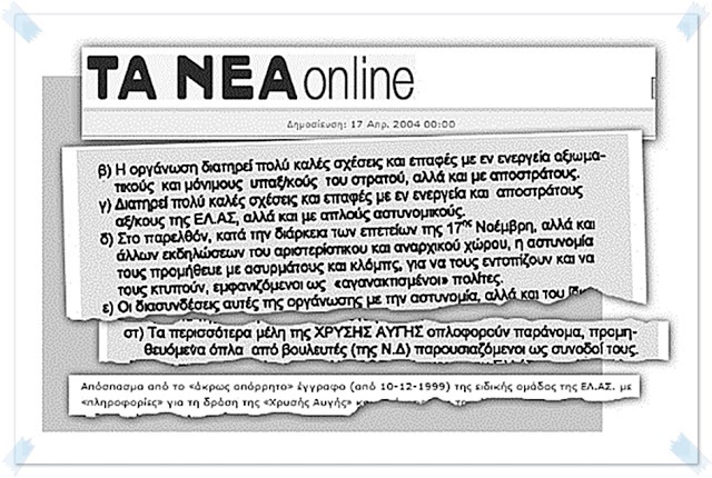 β) Από τις 10/12/1999 (http://www1.rizospastis.gr/story.do?id=7458562&publDate=28/5/2013) υπάρχει εσωτερικό έγγραφο της Ελληνικής Αστυνομίας στο οποίο ομολογείται ότι «η οργάνωση [σ.σ.: η Χρυσή Αυγή] διατηρεί πολύ καλές σχέσεις και επαφές με εν ενεργεία αξιωματικούς και μόνιμους υπαξ/κούς του στρατού, αλλά και με αποστράτους». Ότι «διατηρεί πολύ καλές σχέσεις και επαφές με εν ενεργεία και απόστρατους αξ/κούς της ΕΛ.ΑΣ., αλλά και με απλούς αστυνομικούς». Ότι «στο παρελθόν, κατά τη διάρκεια των επετείων της 17ης Νοέμβρη, αλλά και άλλων εκδηλώσεων του αριστερίστικου και αναρχικού χώρου, η αστυνομία τούς προμήθευε με ασυρμάτους και κλομπς, για να τους εντοπίζουν και να τους κτυπούν, εμφανιζόμενοι ως “αγανακτισμένοι” πολίτες». Εντούτοις, στα 15 χρόνια που πέρασαν από τότε, δεν μάθαμε τίποτα, ποτέ, περί εξάρθρωσης αυτών των θυλάκων του κρατικού μηχανισμού, παρότι διατηρούν τέτοιες – γνωστές στις κυβερνήσεις – σχέσεις με τους ναζί…