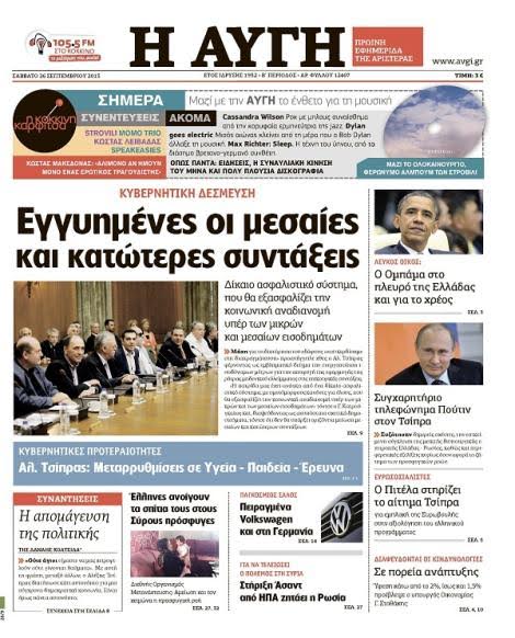 Τώρα, το Σάββατο που μας πέρασε, στις 26/9/2015, η εφημερίδα Αυγή έλεγε – για λογαριασμό της κυβέρνησης – αυτά:
