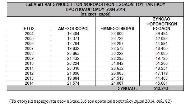Στον πίνακα 3.6 του κρατικού προϋπολογισμού 2014 (σελ. 82) που από το Σάββατο το βράδυ αποτελεί νόμο του κράτους προκύπτει επίσης ότι: Από το 2004 και μετά, οι φόροι που έχει κληθεί να πληρώσει ο ελληνικός λαός ξεπερνούν σωρευτικά το μισό τρισεκατομμύριο ευρώ! Για την ακρίβεια ανέρχονται στα 513,243 δισ. ευρώ.