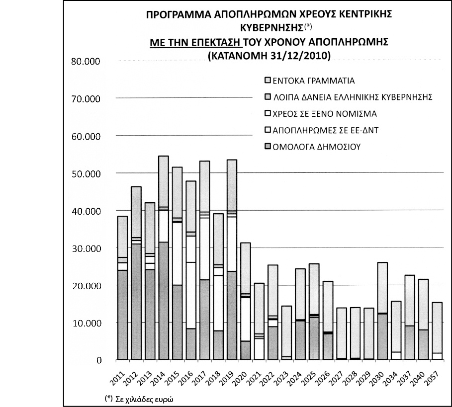 Θα το δούμε λαμβάνοντας υπόψη τα δεδομένα που είχαν προκύψει από την προηγούμενη «επιμήκυνση». Και συγκεκριμένα: Το γράφημα που ακολουθεί δεν είναι δικής μας έμπνευσης. Είναι του υπουργείου Οικονομικών. Είχε εκδοθεί από την τότε κυβέρνηση τον Μάρτη του 2011 με στόχο να προπαγανδίσει τα «κέρδη» της χώρας από τις αποφάσεις της συνόδου της ΕΕ στις 25 του ίδιου μήνα. Στην ανακοίνωσή του το υπουργείο παρουσίαζε τη διαρρύθμιση του δημόσιου χρέους και κατέγραφε το ποσό των ετήσιων αποπληρωμών που – μετά την «επιμήκυνση» – θα έπρεπε να καταβάλλει η Ελλάδα μέχρι το έτος… 2057!