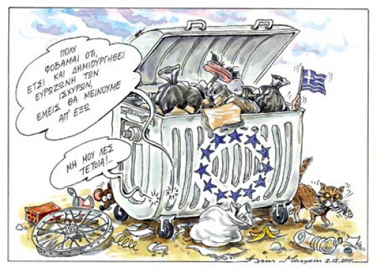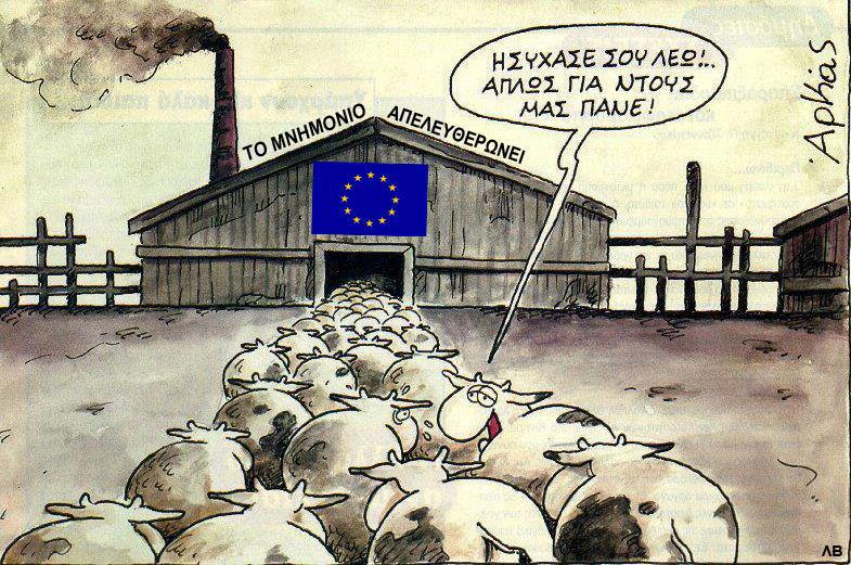 Αυτή είναι η Ελλάδα της ΕΕ. Που κατά τους θιασώτες του «ευρωμονόδρομου» δεν μπορεί να υπάρξει έξω από την ΕΕ, ούτε έξω από το ευρώ. Αλλά τόσο πατριώτες που είναι θα πρέπει να μας εξηγήσουν: Πως γίνεται αυτή η χώρα να υπήρξε εδώ και τρεις χιλιάδες χρόνια, χωρίς ΕΕ και χωρίς ευρώ; Εκτός αν γι’ αυτούς η Ιστορία της Ελλάδας ξεκίνησε μόνο την στιγμή που μπροστά από το ΑΤΜ ο κ.Σημίτης ανέμιζε το ευρώ (σσ: τι απίθανη στιγμή)…