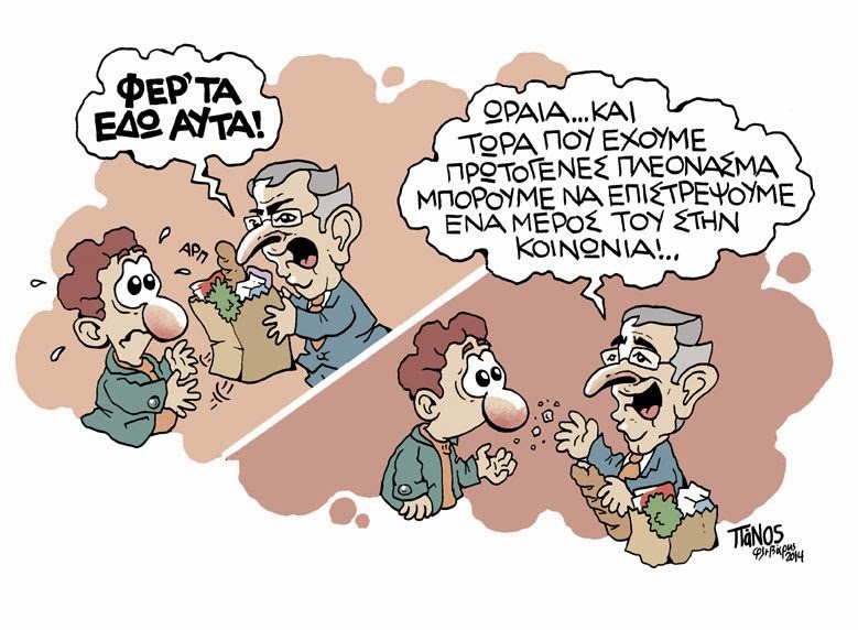 Και κυρίως: Είναι αυτό το πλεόνασμα που τώρα πρέπει κάποιος να έχει κ��τέβει όλα τα σκαλοπάτια του ξεπεσμού για να έρθουν οι ίδιοι που τον οδήγησαν στον ξεπεσμό και να του το πουλήσουν σαν «κοινωνικό μέρισμα»! Αυτό το πλεόνασμα απανθρωπιάς είναι που έχουν το απύθμενο θράσος να το χρησιμοποιούν για το ψηφοθηρικό λάδωμα της προεκλογικής τους μηχανής!