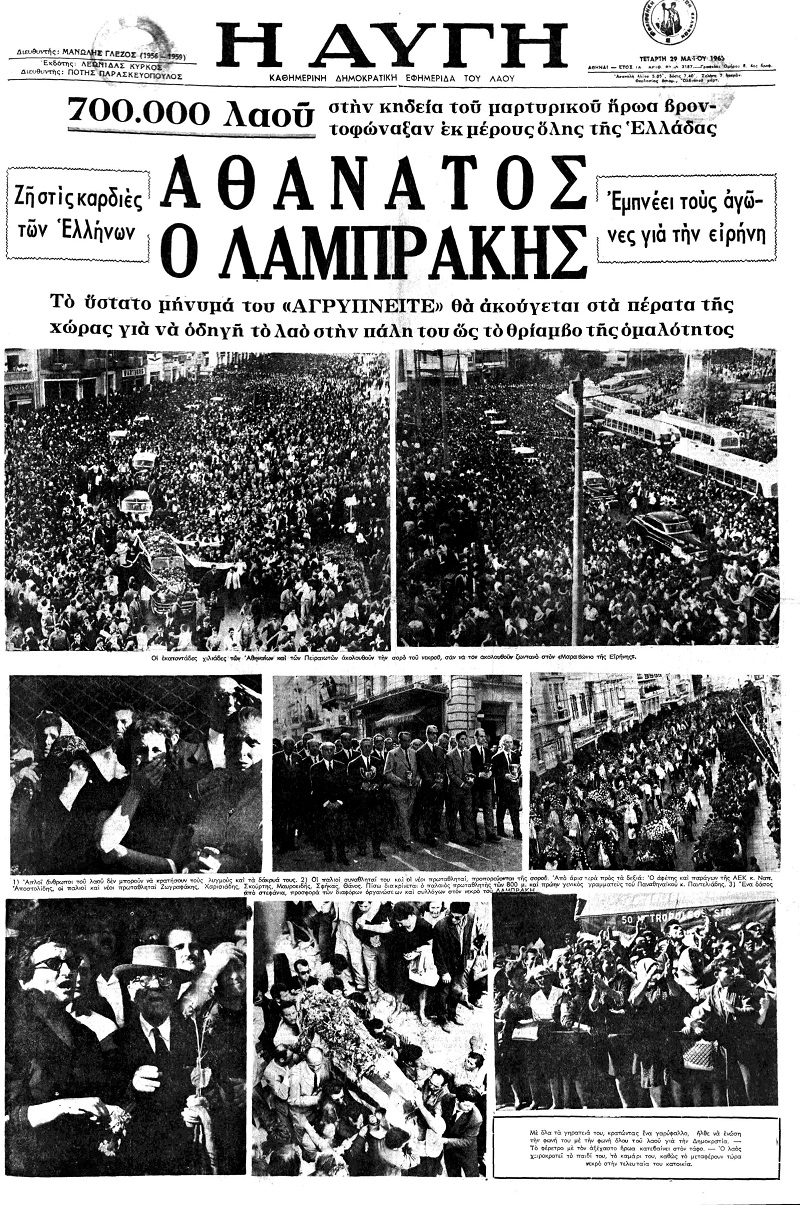 Η μάχη που έδωσε ο Λαμπράκης στην εντατική κράτησε 5 μέρες. Ήταν άνιση. Τα ξημερώματα της 27 Μάη του 1963, ο υφηγητής της Ιατρικής, ο πρωταθλητής στους στίβους, ο μάρτυρας της Ειρήνης και της Δημοκρατίας, ο βουλευτής της Αριστεράς, ο Γρηγόρης Λαμπράκης, αφήνει την τελευταία του πνοή.