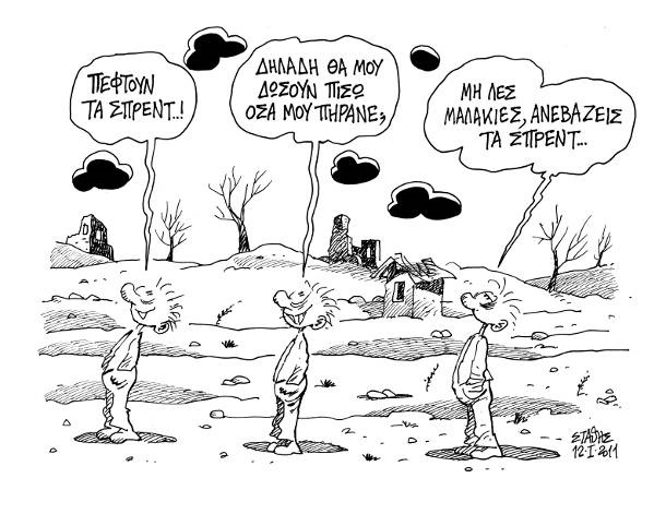 Αλλά οι κυβερνώντες, από τον Παπανδρέου και τον Παπαδήμο μέχρι τον Σαμαρά και τον Βενιζέλο, πανηγυρίζουν… Και αφού με την πολιτική των Μνημονίων εξασφαλίστηκε κάθε λογής ραδιούργος, αεριτζής, τοκογλύφος, άπληστος, κατεργάρης προεξοφλητής χρεογράφων, τραπεζίτης, αφού επιβλήθηκε ό,τι δουλεμπορικο μέτρο είχε σκεφτεί και επεξεργαστεί ο ΣΕΒ τα τελευταία σαράντα χρόνια, η εγχώρια και ευρωπαϊκή μας ηγεσία στρέφει το βλέμμα στον ελληνικό λαό και συστήνει: «Κάντε υπομονή»! «Καλό κουράγιο»! Και εσχάτως: «Έρχεται η ανάκαμψη»!