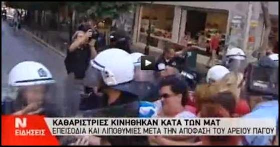 Όπως βλέπετε, κατά τη «ΝΕΡΙΤ», δεν ήταν τα ΜΑΤ που επιτέθηκαν στις καθαρίστριες και πιθανώς δεν ήταν ο «λεβέντης» των ΜΑΤ που γρονθοκόπησε πισώπλατα την καθαρίστρια. Κατά τη «ΝΕΡΙΤ» ήταν οι «Καθαρίστριες (που) κινήθηκαν κατά των ΜΑΤ». Πράγμα που δεν αποκλείει να ήταν η καθαρίστρια εκείνη που επιτέθηκε με το κεφάλι της στη γροθιά του ΜΑΤατζή…