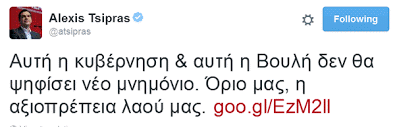 Τώρα έχουμε φτάσει στο σημείο όπου, μετά την ψήφιση του τρίτου Μνημονίου (από την Βουλή που… δεν θα το ψήφιζε), ο κ.Τσίπρας και η κυβέρνησή του να ετοιμάζουν από τη νέα Βουλή την ψήφιση και νέου – τέταρτου – Μνημονίου και να πανηγυρίζουν (!) γιατί βρήκαν τον “κόφτη” με τον οποίο κάθε Απρίλη θα ρημάζουν τους ήδη ρημαγμένους μισθούς και τις ήδη ρημαγμένες συντάξεις!