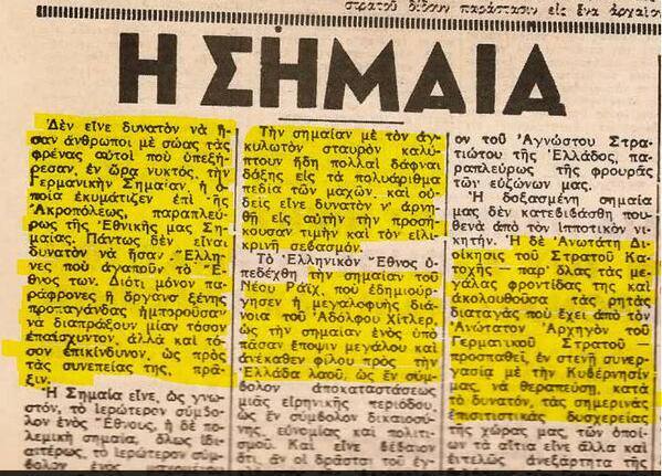 Η εφημερίδα «Βραδυνή» της 1ης Ιουνίου 1941 καταγγέλλει σαν «παράφρονες ή όργανα ξένης προπαγάνδας» αυτούς που κατέβασαν την χιτλερική σημαία η οποία αξίζει «την προσήκουσαν τιμήν και τον ειλικρινή σεβασμόν»…