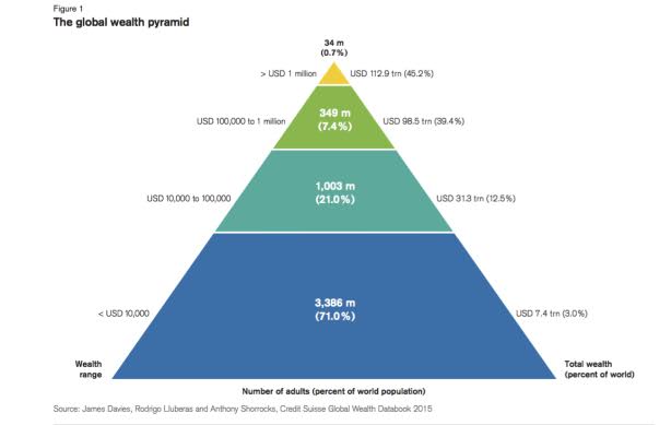 Όπως μαθαίνουμε από την «Credit Suisse», λοιπόν, και από την έκθεση που εκπόνησε για τον Παγκόσμιο Πλούτο, οι γιγαντιαίες ανισότητες στην κατανομή του παγκόσμιου πλούτου εκφράζονται το 2015 ως εξής: