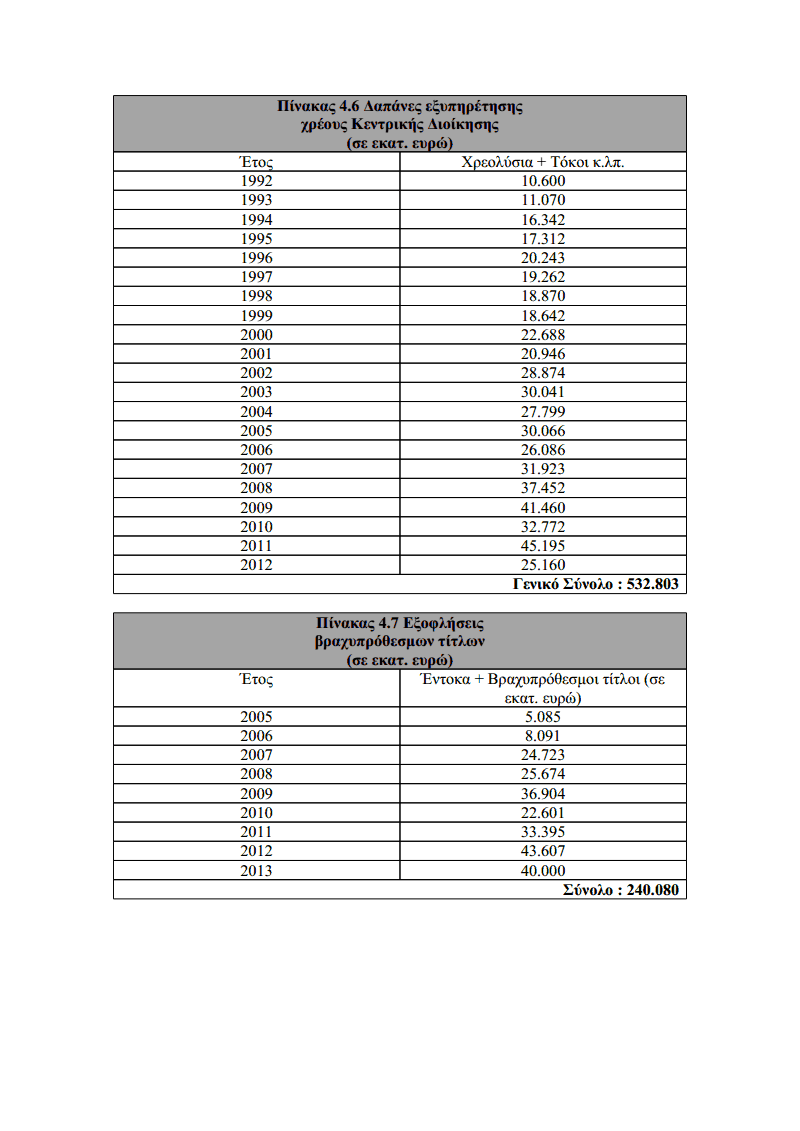 Τα παραπάνω στοιχεία και οι σχετικοί πίνακες, που περιλαμβάνουν τις δαπάνες για την καταβολή τόκων, χρεολυσίων και τις εξοφλήσεις βραχυπρόθεσμων τίτλων και εντόκων γραμματίων, ομολογούνται στην εισηγητική έκθεση του προϋπολογισμού του 2013 (σελίδα 133)