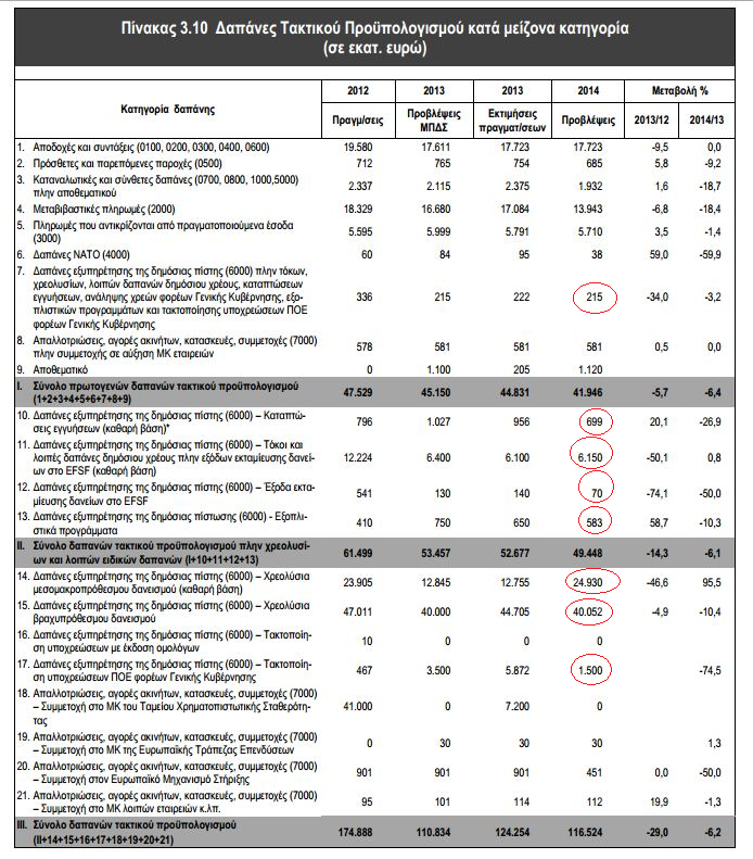 Στον πίνακα 3.10 της εισηγητικής έκθεσης του προϋπολογισμού (σελίδα 89) καταγράφονται οι κωδικοί «Δαπανών Εξυπηρέτησης Δημόσιας Πίστης», δηλαδή οι τόκοι και τα χρεολύσια που καλείται να πληρώσει το ελληνικό κράτος μέσα στο 2014. Το ποσό ανέρχεται αθροιστικά στα 74,2 δισ. ευρώ! Μόνο για τα χρεολύσια μεσομακροπρόθεσμου και βραχυπρόθεσμου δανεισμού (κωδικοί 14 – 15) το ποσό αγγίζει τα 65 δισ. ευρώ!