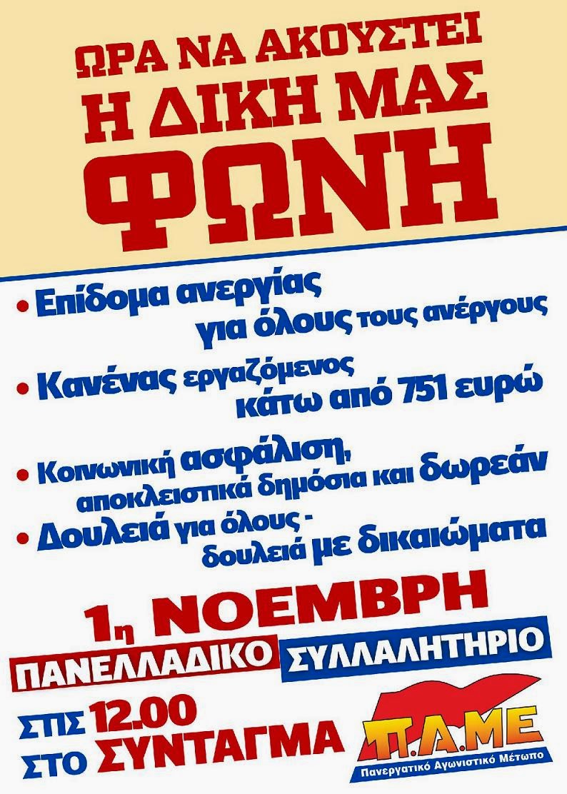 Στην Ελλάδα των 6,3 εκατομμυρίων ανθρώπων που (σύμφωνα με το Γραφείο Προϋπολογισμού της Βουλής) κινούνται στο λυκόφως του κοινωνικού αποκλεισμού και της φτώχειας, αύριο Σάββατο, στις 12 το μεσημέρι, με πρωτοβουλία του ΠΑΜΕ διοργανώνεται στο Σύνταγμα πανελλαδικό συλλαλητήριο ενάντια στην πολιτική της λιτότητας, της ανεργίας, της φτωχοποίησης, των χαρατσιών και της αναγωγής του «ψίχουλου» σε «εγγυημένο εισόδημα». Αποφάσεις συμμετοχής στο συλλαλητήριο έχουν πάρει πάνω από 940 Εργατικά Κέντρα, Ομοσπονδίες, Σωματεία και κοινωνικοί φορείς. Το εύρος της συμμετοχής είναι προφανές ότι ξεπερνά κατά πολύ την ακτίνα επιρροής του ΠΑΜΕ ή του ΚΚΕ. Εντούτοις δεν λείπουν τα γνωστά περί «καπελώματος» κλπ επειδή την πρωτοβουλία την πήρε το ΠΑΜΕ.