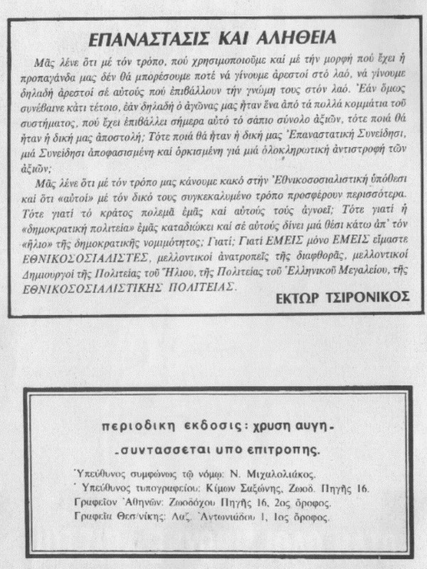Στο περιοδικό της Χρυσής Αυγής, στη δεύτερη σελίδα, μέσα σε ειδικό πλαίσιο ώστε να τονίζεται ευδιάκριτα ο ναζισμός τους, δημοσιεύτηκε κείμενο (τεύχος Δεκέμβρη 1983) υπό τον τίτλο «ΕΠΑΝΑΣΤΑΣΙΣ ΚΑΙ ΑΛΗΘΕΙΑ», το οποίο καταλήγει ως εξής: