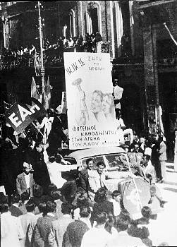 Κάτω από τα τεράστια πανό του ΕΑΜ και του ΚΚΕ που υψώνονται στους δρόμους της Αθήνας, παρελαύνουν σε μια θύελλα ζητωκραυγών και ενθουσιασμού τα ένοπλα τμήματα του ΕΛΑΣ και της ΕΠΟΝ που βδομάδες πριν την αποχώρηση των Γερμανών έχουν ήδη απελευθερώσει τους δήμους γύρω από την πρωτεύουσα.