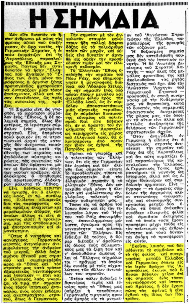 «Δεν είναι δυνατόν να ήσαν άνθρωποι με σώας τας φρένας αυτοί που υπηξαίρεσαν εν ώρα νυκτός, την Γερμανικήν σημαίαν, η οποία εκυμάτιζεν, επί της Ακροπόλεως, παραπλεύρως της Εθνικής μας Σημαίας. (…) Διότι μόνον παράφρονες ή όργανα ξένης προπαγάνδας ημπορούσαν να διαπράξουν μιαν τόσο επαίσχυντο (…) πράξιν (…). Το Ελληνικό Έθνος αποδέχθη την σημαίαν του Νέου Ράιχ, που δημιούργησεν η μεγαλοφυής διάνοια του Αδόλφου Χίλτερ, ως σημαίαν ενός υπό πάσαν άποψιν μεγάλου και ανέκαθεν φίλου προς την Ελλάδα λαού, ως εν σύμβολον αποκαταστάσεως μιας ειρηνικής περιόδου, ως εν σύμβολον δικαιοσύνης (…) και πολιτισμού. Και είναι βέβαιον ότι αν ο δράσται του εγκλήματος της, περιήχοντο εις χείρας του ελληνικού λαού, θα λυντσάροντο από αυτόν τον ίδιον ως εχθροί της πατρίδος μας».