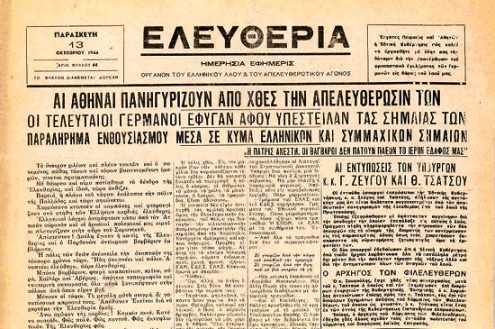 Την επομένη της Απελευθέρωσης, την Παρασκευή 13 Οκτώβρη 1944, η εφημερίδα στο ρεπορτάζ με τίτλο «ΛΕΥΤΕΡΙΑ! ΛΕΥΤΕΡΙΑ! Η ΑΘΗΝΑ ΓΙΟΡΤΑΖΕΙ», ανάμεσα στα άλλα έγραφε: