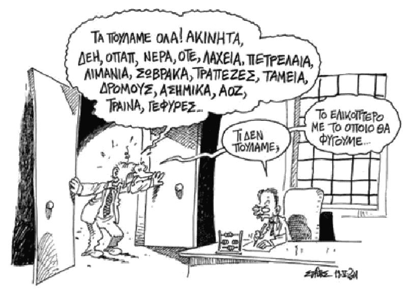 Ωστόσο στην Ελλάδα, οι κοσμοπολίτες του ξεπουλήματος, που αποκαλούν τους άλλους «επαρχιώτες», πουλούν φούμαρα περί «επωφελών ιδιωτικοποιήσεων που μειώνουν το χρέος», όταν είναι αποδεδειγμένο πως όσο περισσότερο ξεπουλούν – στη Βρετανία, στην Ελλάδα, στη Γουαδελούπη – τόσο περισσότερο το χρέος αυξάνεται! Και τούτο διότι πολύ απλά το δημόσιο χρέος, με ή χωρίς ιδιωτικοποιήσεις, συνεχίζει να συνιστά «το μοναδικό κομμάτι του λεγόμενου εθνικού πλούτου, που στους σύγχρονους λαούς ανήκει πραγματικά στο σύνολο του λαού» που αξιοποιείται ως ένας «από τους πιο δραστικούς μοχλούς της πρωταρχικής συσσώρευσης» του κεφαλαίου μέσα από την κλοπή του λαού και μέσα από το «ξεπούλημα του κράτους (Καρλ Μαρξ, Το Κεφάλαιο, Α’ τόμος, σελ. 779).