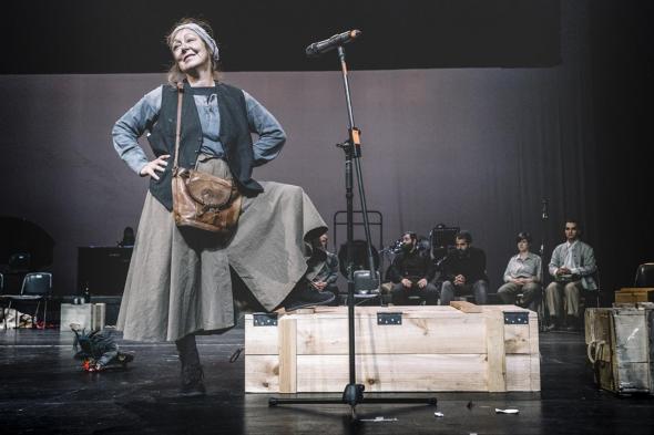 ΑΝΕΒΗΚΑ στην Θεσσαλονίκη σε μια εποχή που η θεατρική Αθήνα δοκιμάζεται έντονα από την κρίση και είδα πως το κοινό της έχει αγκαλιάσει με μεγάλη θέρμη τις παραγωγές της. Παίρνει… Κουράγιο κανείς από αυτό, όπως παίρνει κουράγιο απολαμβάνοντας το ρεσιτάλ ερμηνείας της σημαντικής Λυδίας Φωτοπούλου στην κατά Μιλιβόγιεβιτς «Μάνα Κουράγιο». Η εξαιρετική ηθοποιός επέστρεψε στην Θεσσαλονίκη που έχει πετύχει μερικές από τις πιο ακριβές ερμηνείες της και… κεντά φωτίζοντας όλες τις πτυχές της ηρωίδας του Μπρεχτ-η κίνησή της έξοχη, η φωνή της στα τραγούδια του Ντεσάου που παίζονται ζωντανά από ορχήστρα η οποία βρίσκεται επί σκηνής θαυμάσια και η υποκριτική της δεινότητα μοναδική. Δεν χορταίνει να την απολαμβάνει να γίνεται η Μάνα-στην σκηνή που ψιθυρίζει στο κοινό πως το παράκανε με τα παζάρια για το κάρο της βάζοντας σε κίνδυνο τη ζωή του γιου της κόβει την ανάσα. Συναρπάζει το νανούρισμά της στη νεκρή κόρη της και συνταράσσει η σκηνή του φινάλε που τραβάει τα σκοινιά που σέρνουν το κάρο -που δεν υπάρχει με την σκηνοθετική γραμμή του Μιλιβόγιεβιτς – Μια μεγάλη ηθοποιός σε μεγάλη «νίκη» της.