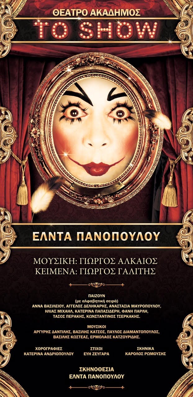ΑΠΑΓΟΡΕΥΜΕΝΗ ΑΤΖΕΝΤΑΑΠΟΚΛΕΙΣΤΙΚΟΤου ΒΑΣΙΛΗ ΜΠΟΥΖΙΩΤΗΠρώτος σου έγραψα για το εξαιρετικά υποσχόμενο θέαμα «TO SHOW» που έχει στα σκαριά η πολυσχιδής-πολυτάλαντη Έλντα Πανοπούλου με μια σειρά από γερούς συνεργάτες και πρώτος τώρα εξασφάλισα την απόλυτη… μεταμόρφωσή της για αυτό. Ιδού η πόζα που έγινε και η αφίσα της δουλειάς που έρχεται στο θέατρο «Ακάδημος» σε σκηνοθεσία της Έλντας Πανοπούλου. Τη μουσική έγραψε ο Γιώργος Αλκαίος, τα κείμενα ο Γιώργος Γαλίτης, τις χορογραφίες η Κατερίνα Ανδριοπούλου, τους στίχους η Εύη Ζευγαρα, τα σκηνικά ο Κάρολος Ρωμούσης.Στο πλευρό της η Έλντα Πανοπούλου θα έχει τους (με αλφαβητική σειρά):Α.Βασιλείου, Α.Δεληκάρης, Α.Μαυροπούλου, Η.Μιχαήλ, Κ.Παπασιδέρη, Φ.Παρλή, Τ.Περάκης, Κ.Τσερκακης. Μαζί τους και οι μουσικοί Α.Δαντιλης, Β.Κατσος, Π.Διαμαντόπουλος, Β.Κωστέας ,Ε.Κατζουρίδης. Ραντεβού στον Ακάδημο!