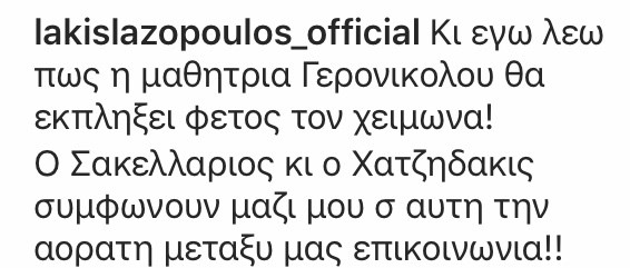 Εντυπωσιασμένος είναι ο Λάκης Λαζόπουλος από την… Λίζα του- κατά κόσμο Κατερίνα Γερονικολού που δουλεύει πολύ σκληρά για να κερδίσει το απαιτητικό στοίχημα της! Βλέποντάς της να ανθίζει στις πρόβες που κάνουν για τα Χτυποκάρδια στο θρανίο αρέσοντας πολύ και στην πρόζα και στο τραγούδι και στο χορό, αποφάσισε να την εμψυχώσει και μέσω του Instagram!Ανέβασε φωτογραφία τους με τη λεζάντα: «Κι εγώ λέω πως η μαθήτρια Γερονικολού θα εκπλήξει φέτος τον χειμώνα! Ο Σακελλάριος και ο Χατζηδάκις συμφωνούν μαζί μου σ’αυτην την αόρατη μεταξύ μας επικοινωνία»! Ανυπομονούμε! Δείτε την ανάρτηση: