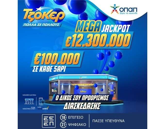 Όσοι επιθυμούν να συμμετάσχουν στην κλήρωση για το mega τζακ ποτ των 12,3 εκατομμυρίων ευρώ μπορούν να καταθέτουν τα δελτία τους έως τις 21:30 στα καταστήματα ΟΠΑΠ σε όλη την Ελλάδα, ή διαδικτυακά, από όπου κι αν βρίσκονται, μέσω του opaponline.gr. Τόσο στα καταστήματα ΟΠΑΠ όσο και online, οι παίκτες έχουν τη δυνατότητα να συμμετάσχουν και σε ομαδικά δελτία ΤΖΟΚΕΡ.