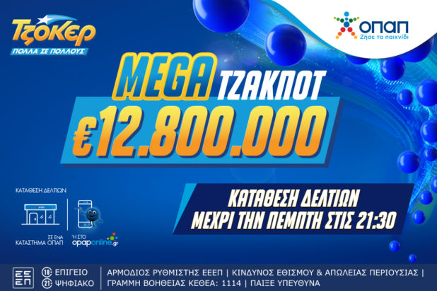 Όσοι επιθυμούν να συμμετάσχουν στην αποψινή κλήρωση για το mega τζακ ποτ των 12,8 εκατ. ευρώ μπορούν να καταθέτουν τα δελτία τους έως τις 21:30 στα καταστήματα ΟΠΑΠ όλης της Ελλάδας, ή διαδικτυακά, από όπου κι αν βρίσκονται, μέσω του opaponline.gr.