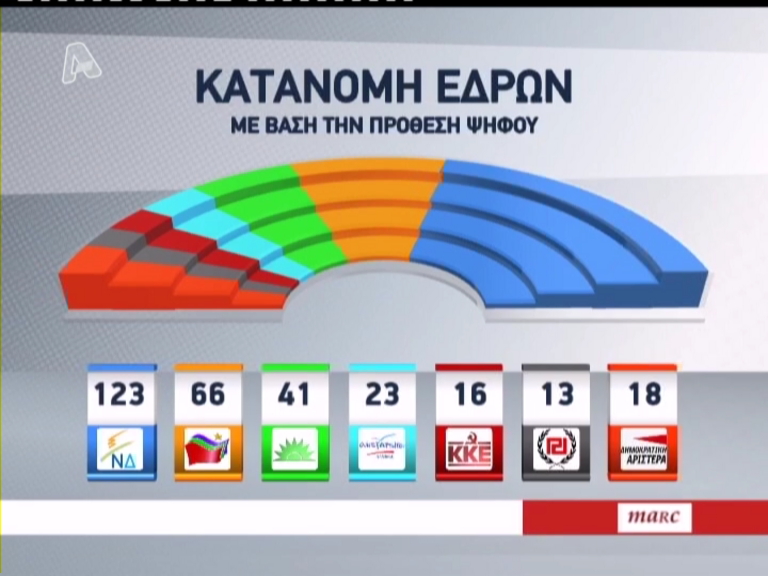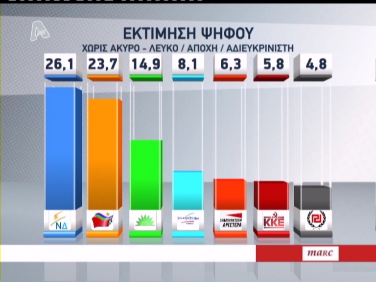 Πρωτιά στη ΝΔ δίνει η νέα δημοσκόπηση της marc για τον ALPHA που πραγματοποιήθηκε μεταξύ 15 και 17 Μαίου. Στην πρόθεση ψήφου, προηγείται η ΝΔ με 23,1% και ακολουθεί με διαφορά δύο μονάδων ο ΣΥ.ΡΙΖ.Α. με 21%. Στην τρίτη θέση βρίσκεται το ΠΑΣΟΚ που συγκεντρώνει 13,2%. Ακολουθεί ο Πάνος Καμμένος με 7,2%, η ΔΗΜ.ΑΡ. με 5,6%, το ΚΚΕ με 5,1% και η Χρυσή Αυγή με 4,3%.Πολύ χαμηλά είναι τα ποσοστά των κομμάτων που στις εκλογές της 6ης Μαίου έδιναν τη μάχη για είσοδο στη βουλή, όπως του ΛΑ.ΟΣ., της ΔΗ.ΣΥ. και των Οικολόγων Πράσινων. Το ποσοστό των αναποφάσιστων ανέρχεται στο 8,7%.